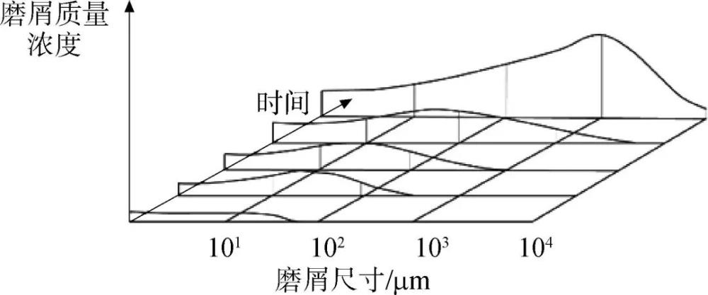 主軸軸承通常都有大流量潤滑油循環(huán)使用,當出現(xiàn)磨損、疲勞等會產(chǎn)生顆粒進入潤滑油。潤滑系統(tǒng)中的磨屑質(zhì)量濃度和顆粒尺寸會隨時間變化,如圖4所示,根據(jù)潤滑系統(tǒng)中的磨屑尺寸、質(zhì)量濃度、形貌、成分可以判斷設備是否故障及故障位置。